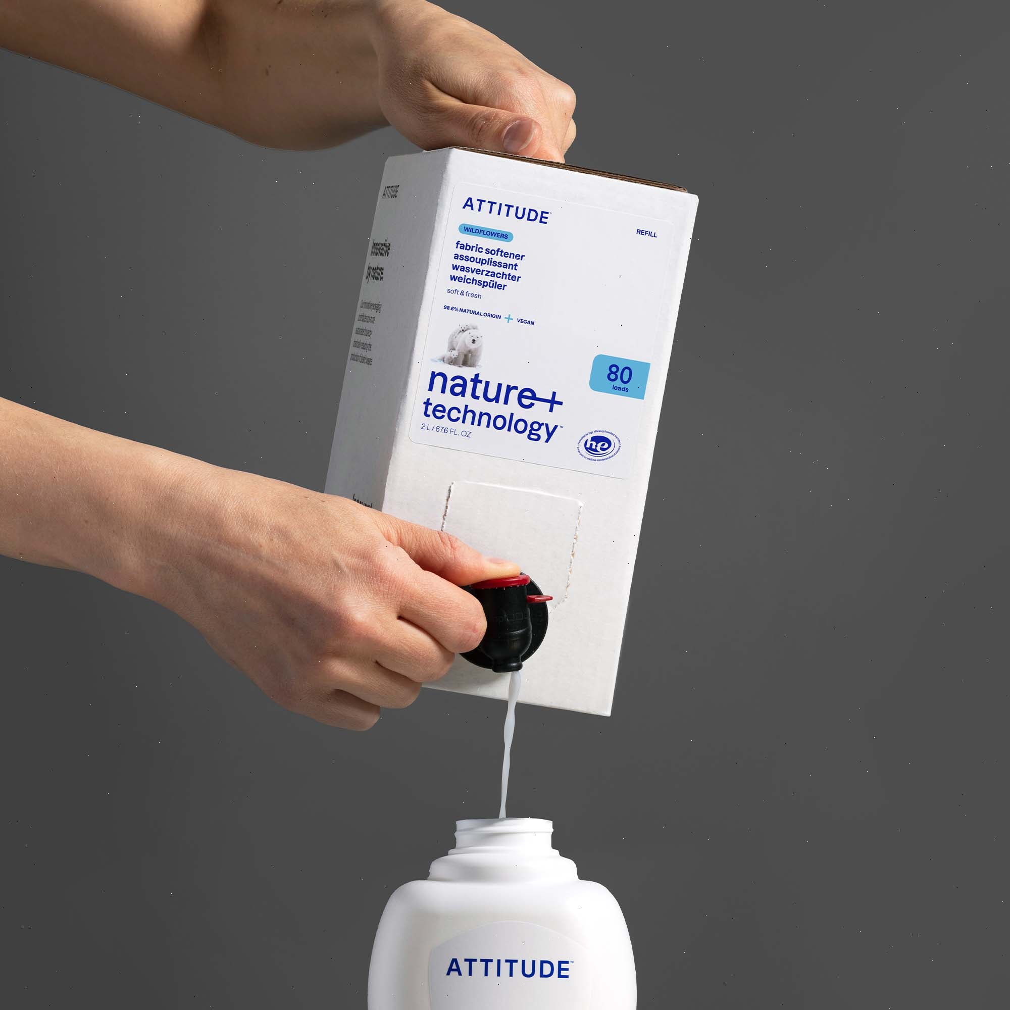 Formulated with 98% naturally derived ingredients, ATTITUDE™ fabric softener leaves your clothes feeling gentler, fresher and more comfortable. The orange blossom and vanilla perfectly balance the wood aroma, which anchors the fragrance in perfectly sweet and floral notes. It’s a symphony of scents that leaves your laundry smelling like a bouquet of wildflowers. The bottle is made from HDPE #2 plastic—the easiest plastic to recycle—and can be reused again and again thanks to our innovative eco-refills. Its vegan formula is offered in a 2 L eco-refill format that’s easy to carry and use at home. Gentle on both your skin and the planet.