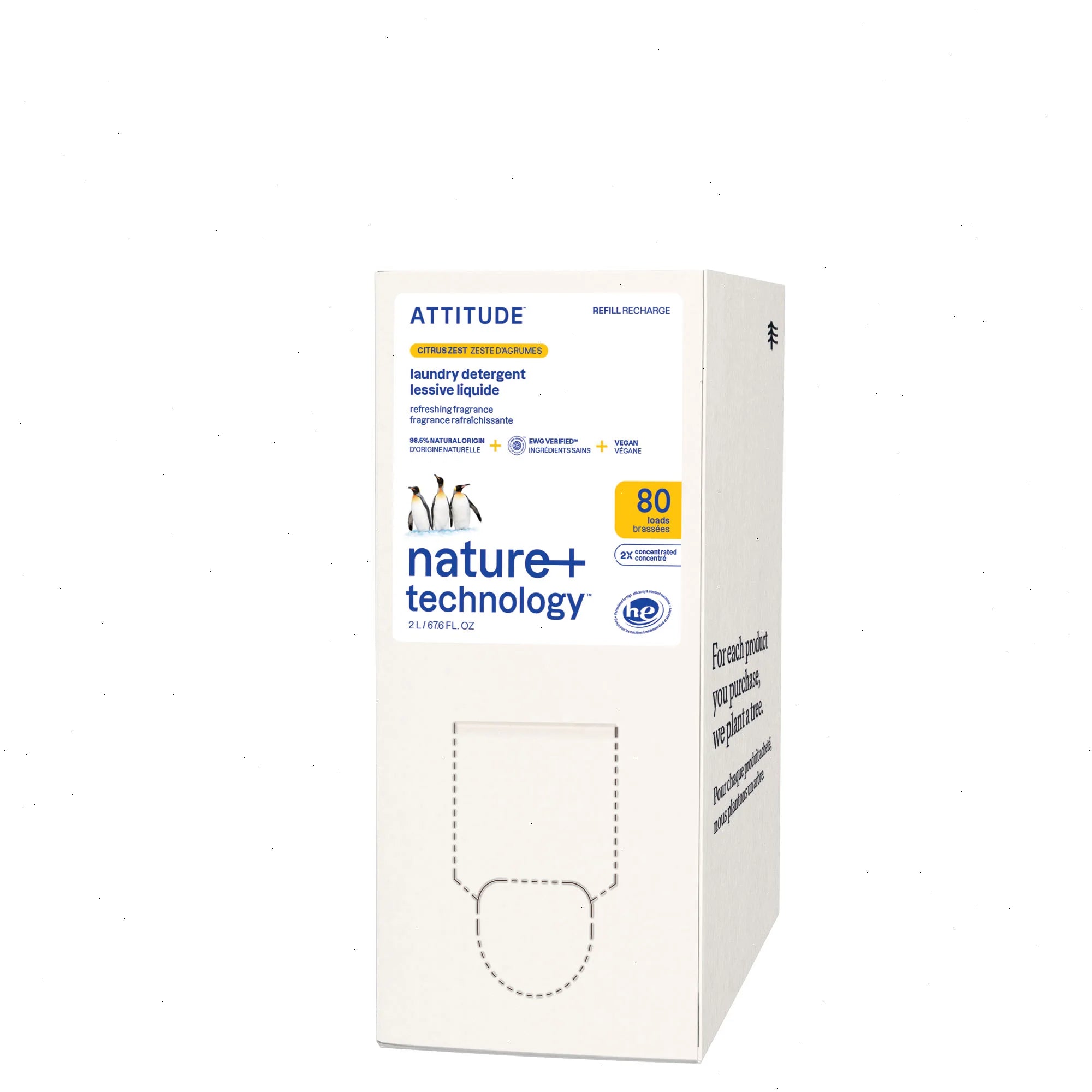 Formulated with 98% naturally derived ingredients, ATTITUDE™ laundry detergent packs excellent detergent power and is free of enzymes. Its invigorating citrus top notes blend harmoniously with floral and herbaceous lavender. Its concentrated formula allows you to do more loads while using the same amount of detergent. Our laundry detergent is effective for cold water wash, saving you energy. Its vegan formula is certified by PETA and is offered in a 2L eco-refill format that’s easy to carry and use at home.