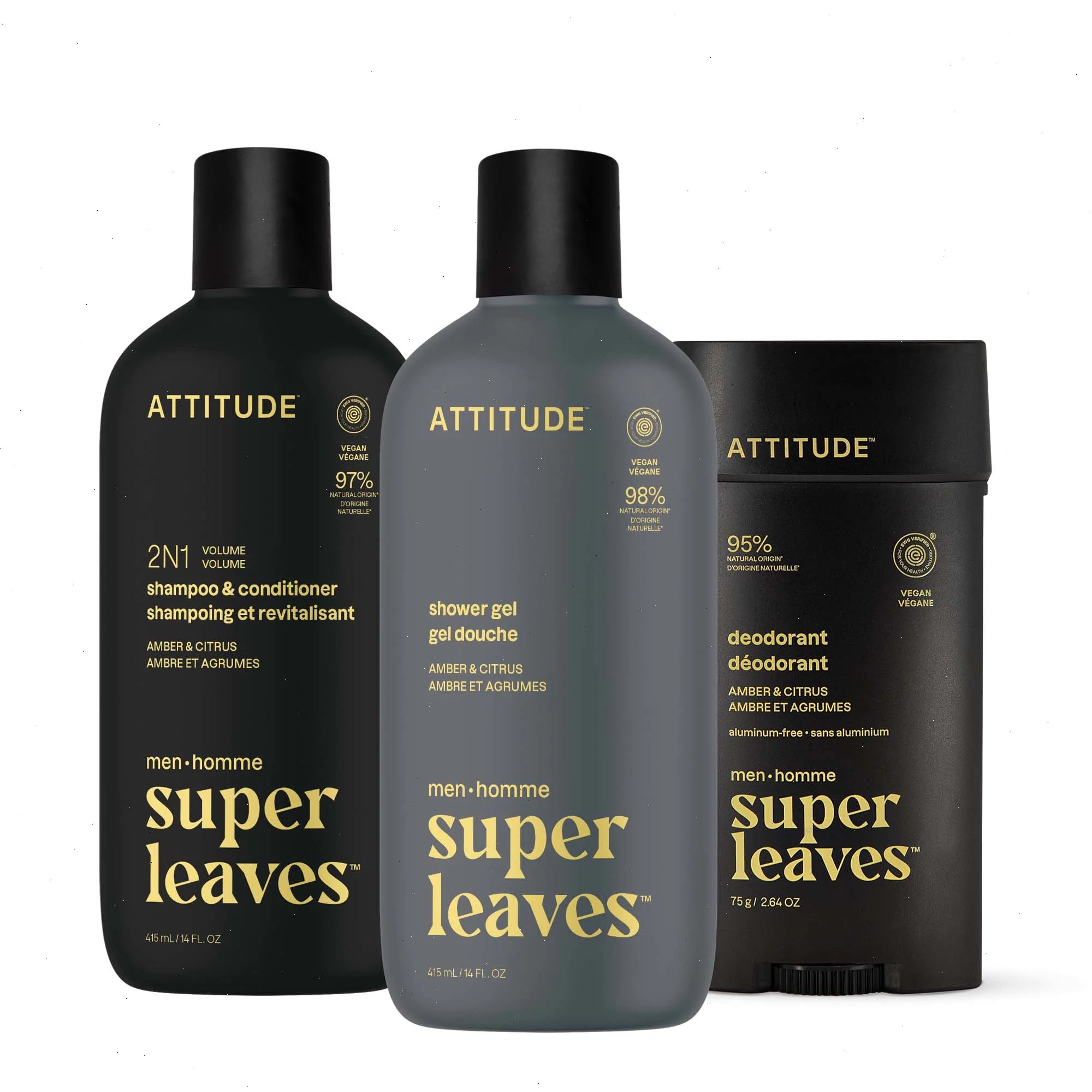 Elevate your daily routine with our complete men's grooming bundle. This bundle includes men's deodorant, men's body wash, and men's shampoo and conditioner, all formulated with over 95% naturally derived ingredients*. Our EWG Verified® vegan formulas deliver high-performance results, while the invigorating scent refreshes your senses and prepares you to tackle the day ahead.Â
